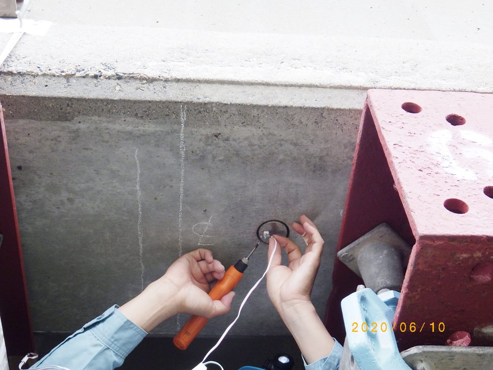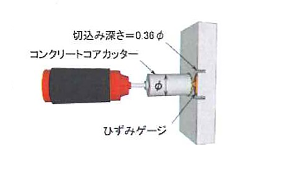 コア応力解放法は,応力調査の対象箇所に二方向のひずみゲージを貼り付け,コアを切り込むことによって解放されるひずみを測定する方法です。二方向のひずみ差と算定式により乾燥収縮とクリープひずみの影響を消去することで,知りたい有効応力を取り出すことができます。